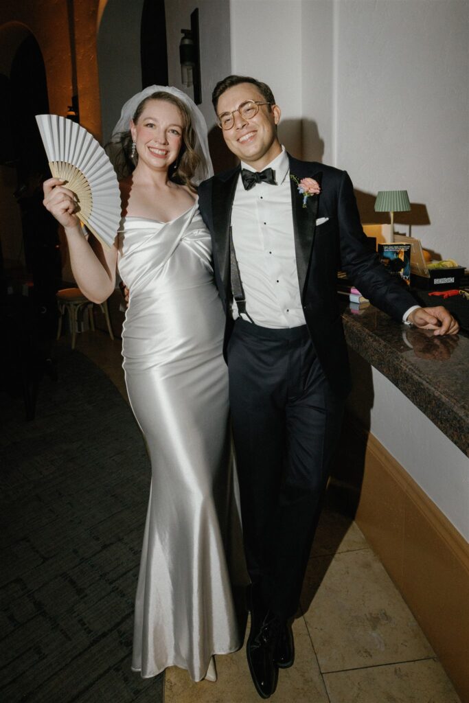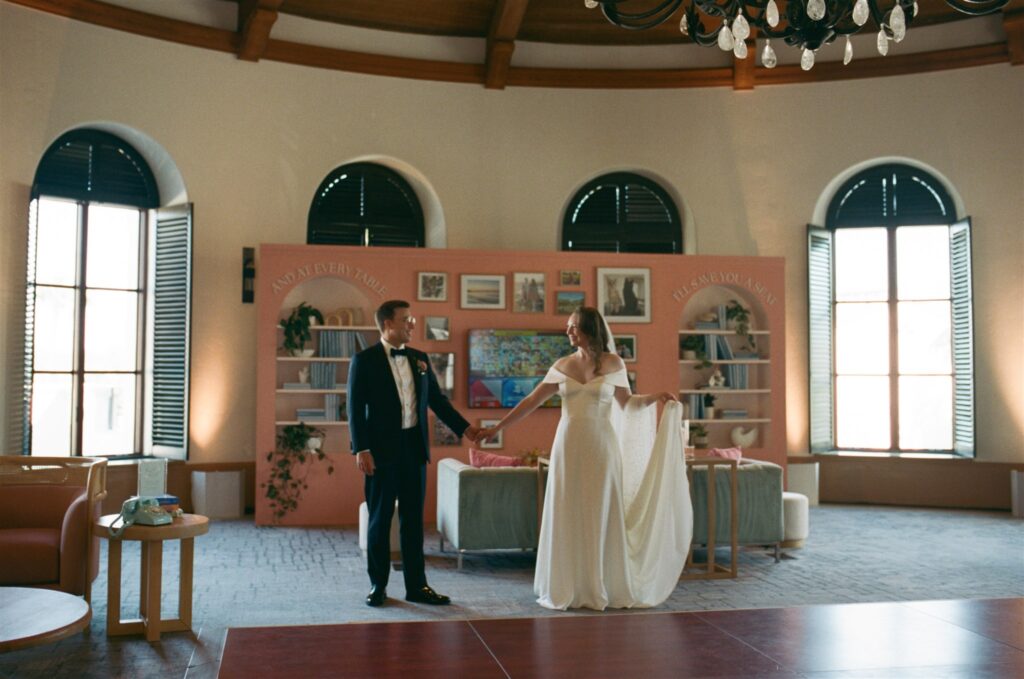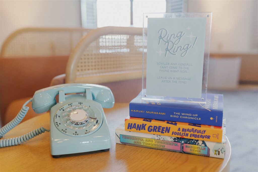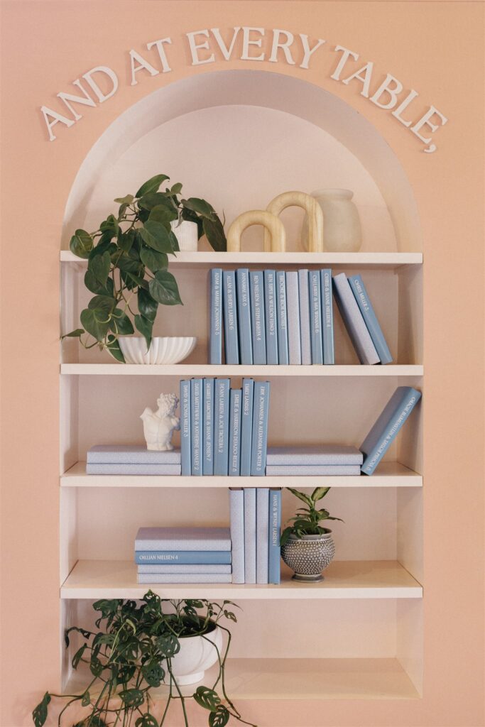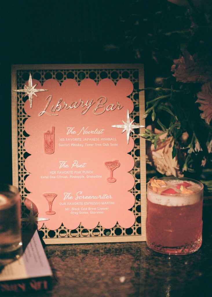 Kendall’s love of literature shone through in charming touches like the postcard-style guest sign-in, the “Library Bar” during cocktail hour, and the bookmark name cards at the reception. Schyler’s minimalist, refined aesthetic provided the perfect counterbalance, creating a harmonious blend that captured their relationship’s effortless balance.
